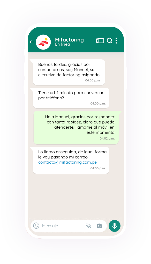 Obtén el capital de trabajo que necesitas con Mifactoring, contáctanos a través de nuestros canales: teléfono, wasap, correo